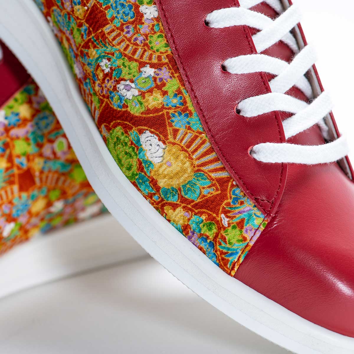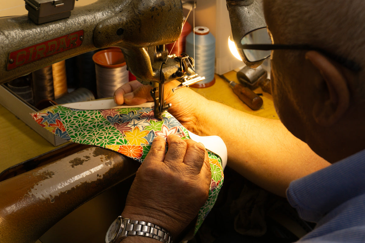 現代では、仕立てられずに残っていたり、わずかな難で出番を失った反物が多く存在します。 和魂は、そうした反物を古くから履物問屋を営んでいる職人たちの手によって、見た目も機能も高品質な本革スニーカーへアップサイクル。